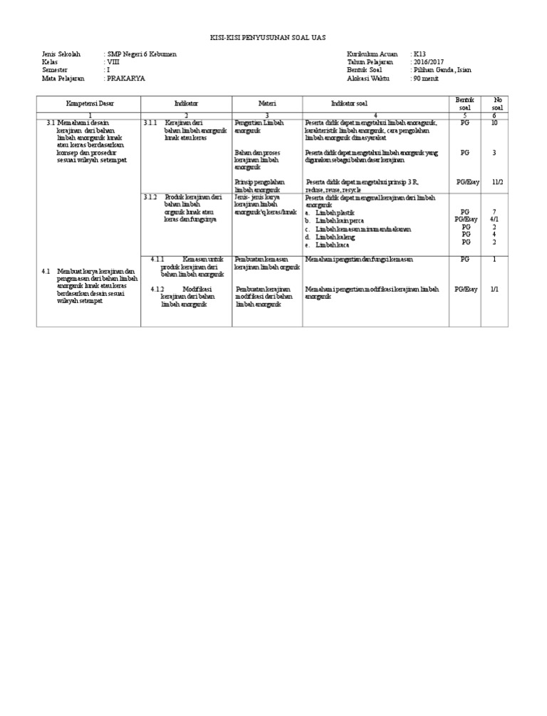 Kisi Kisi Uas Prakarya Kelas 7 Smp Mts K13 Tahun 2018 2019